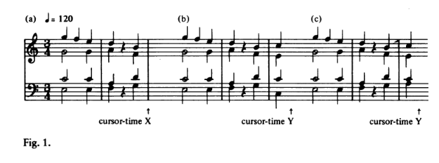Imagine a string ensemble playing the score shown by Figure 1(a), producing an acoustic signal which we shall call Signal(a). We ask, just what am I “perceiving” as I listen musically to that signal at the now-time corresponding to cursor-time X on the score. According to Husserl’s theory, what I am perceiving—let us call it Perception(a)—is a hugely complex network of things, things including other perceptions, their relations among themselves, and their relations to Perception(a) itself. I have, for example, perceptions (a1) ” harmony over the last beat”, (a2) “5th degree bass over the last beat.” and (a3), “7th degree in the melody over the last beat.” I perceive how the perceptions (a1), (a2), and (a3) are interrelating amongst themselves. I perceive how each of them is relating to my overall Perception(a) at cursor-time X. And I am retaining perceptions of how (a1), (a2), and (a3) each relate to yet earlier perceptions. […] “The C eight-three chord” is not an object of my perception at time X, at least not directly. The chord is perceived only indirectly, as an object of Perception(b), which is as yet perceived only as an object of Perception(a). It is not “the C chord” which is “very likely coming up in one beat’s time,” as I perceive things at X. Listening at that time to Signal(a), I do not form the idea of a disembodied C major chord coming up over the next beat as a context-free phenomenon. I do have a mental construct of a C major chord coming up over the next beat, but only in the context of a broader mental construct that is Perception(b).
